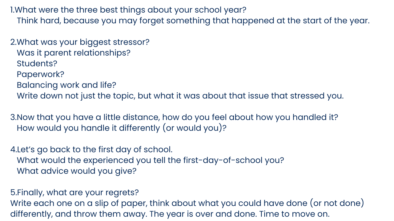 From my experience, it’s worth it to think about these five items. My final recommended activity is that you write yourself a postcard. Based on your reflection, what do you want to tell yourself for next year? Be realistic, but hopeful. And then, relax and take some time for yourself this summer. And remember, you made a difference this year, even if it didn’t feel like it.